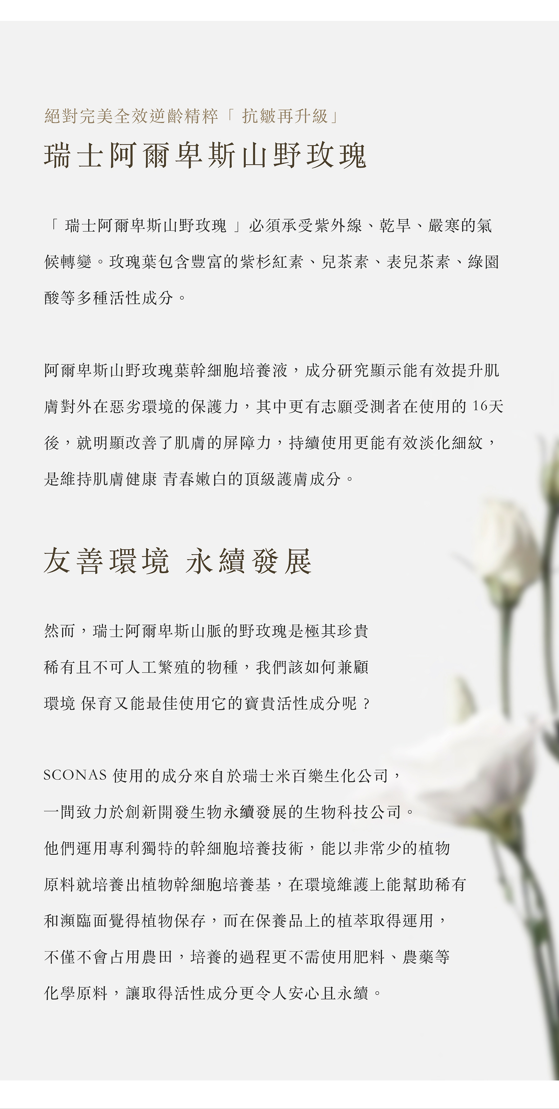 可活化肌膚,偕同肌膚健康代謝,其高效保濕機能,能因應季節加強補充肌膚水份,且能有效改善敏感性皮膚的不適狀況,減少皺紋的發生。