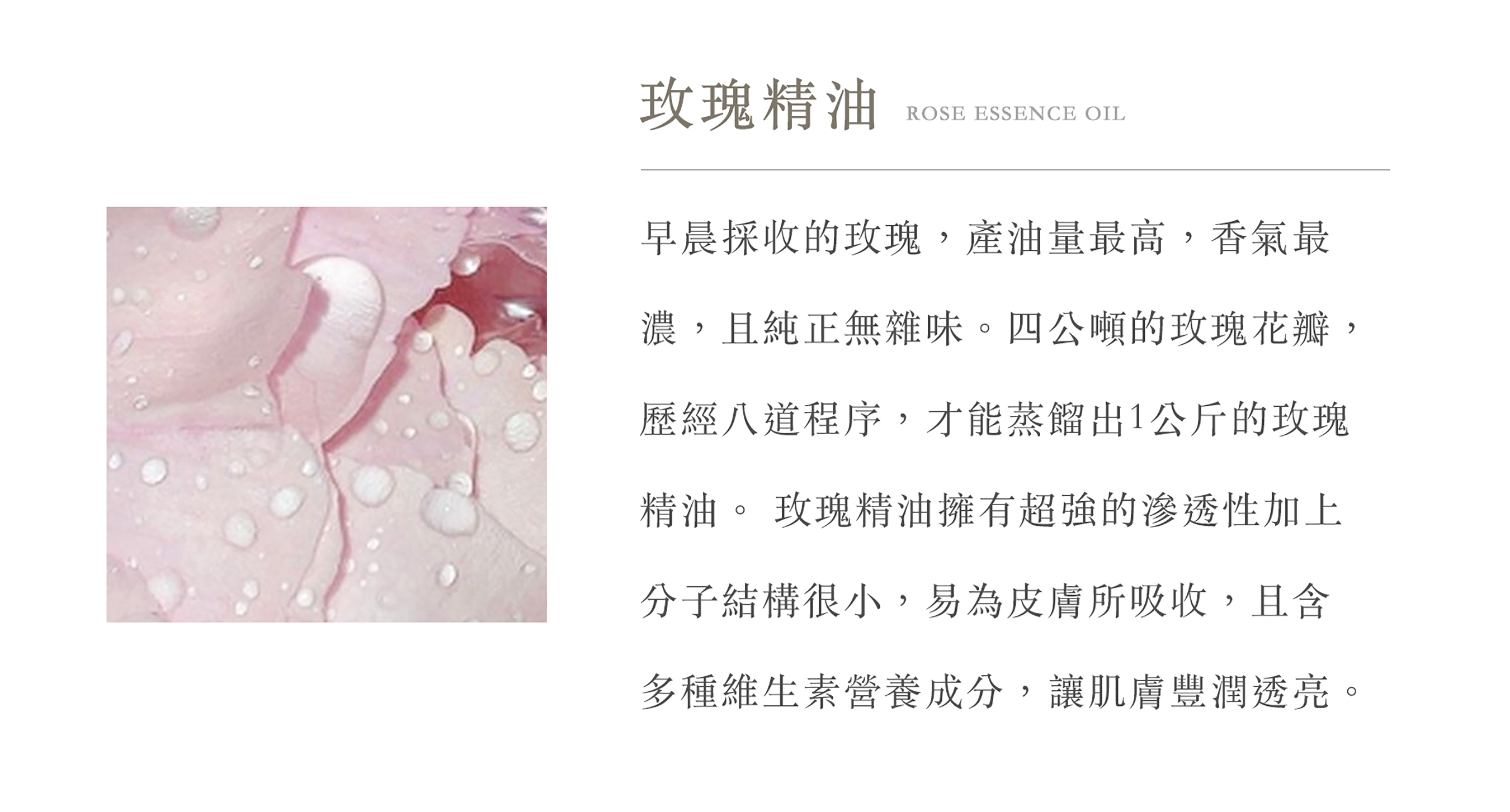 | 主要訴求 | 融合100%有機玫瑰純露與黃金荷荷巴油,深層滋養並修護抗老。高濃度二裂酵母結合南非復活草,能強化肌膚屏障、抵禦藍光,從肌底改善乾燥,重現飽滿緊緻光澤 |
