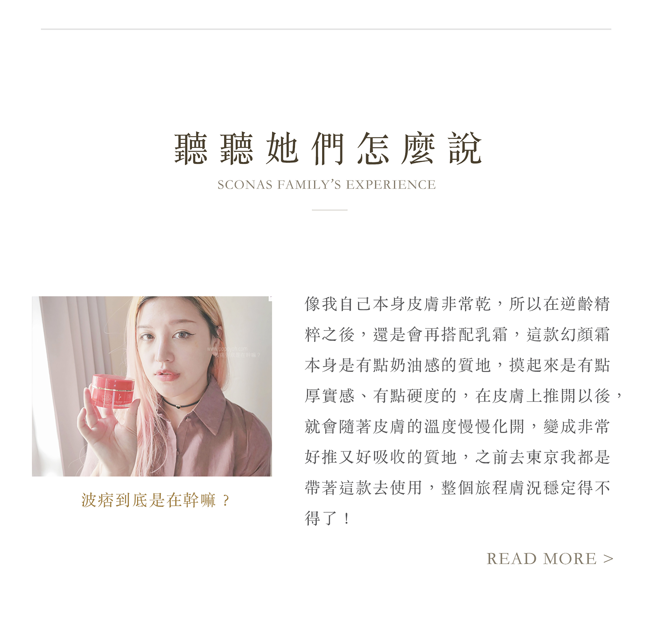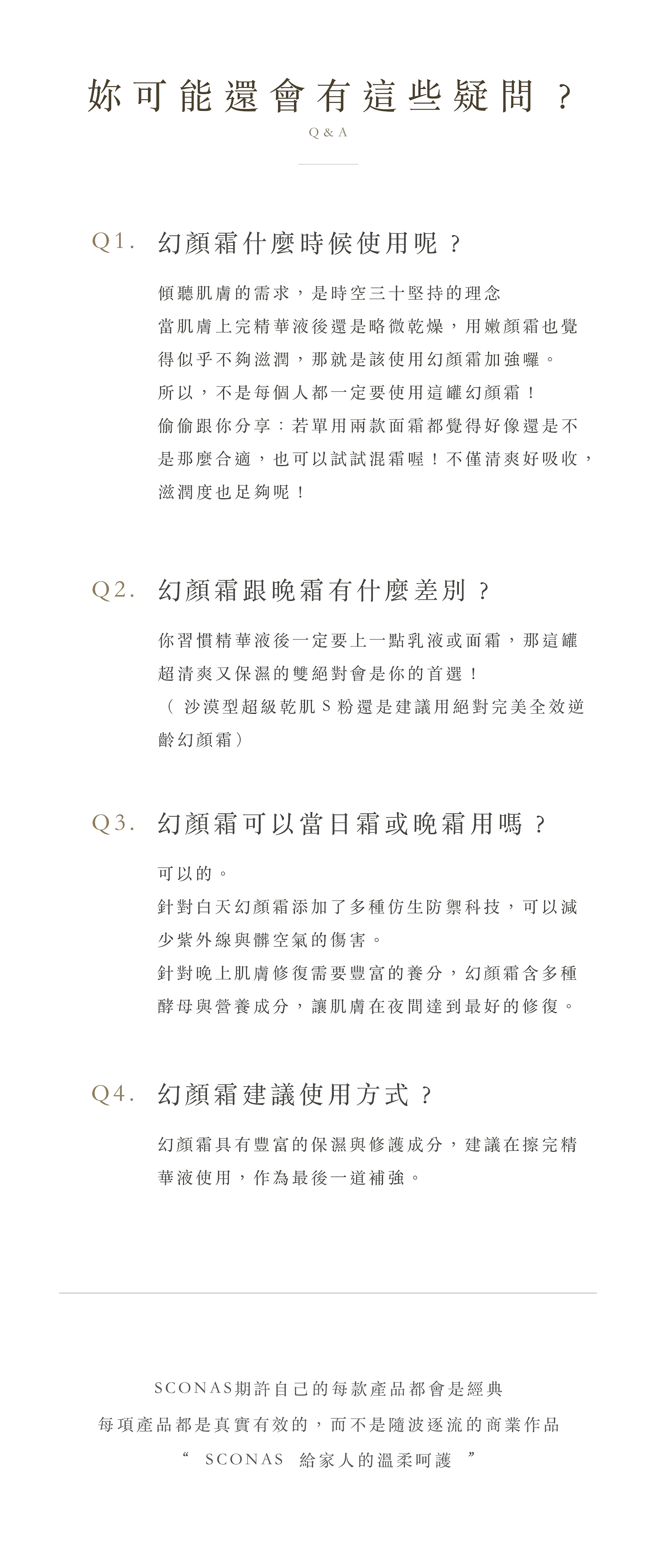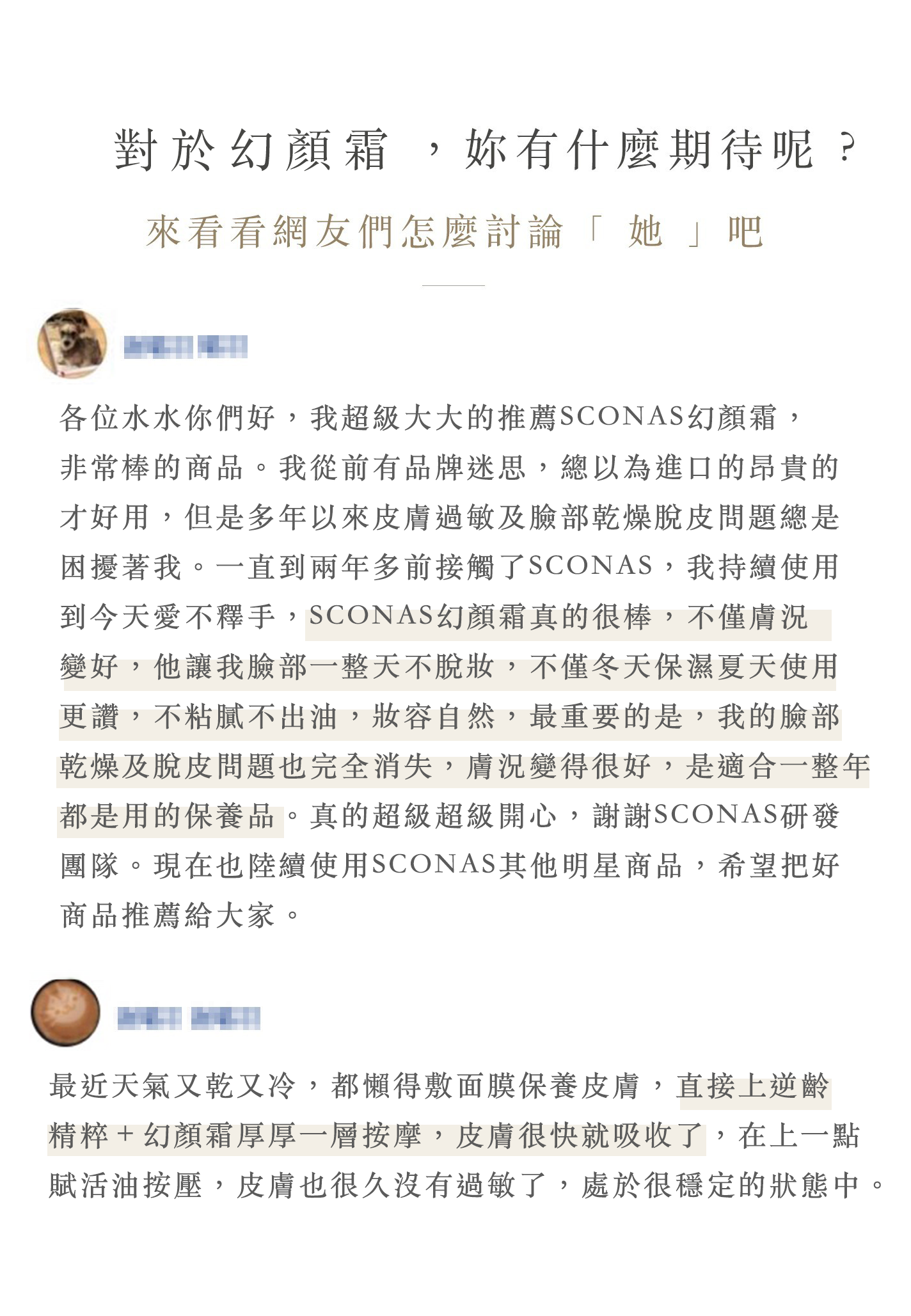 | 溫馨提醒 | ※ 沒有任何一樣保養品適合所有人,使用後若出現不適,請立即停止使用並觀察肌膚後續狀況,聯繫 Sconas 客服,若有需要,視情況尋求皮膚科醫師協助 |