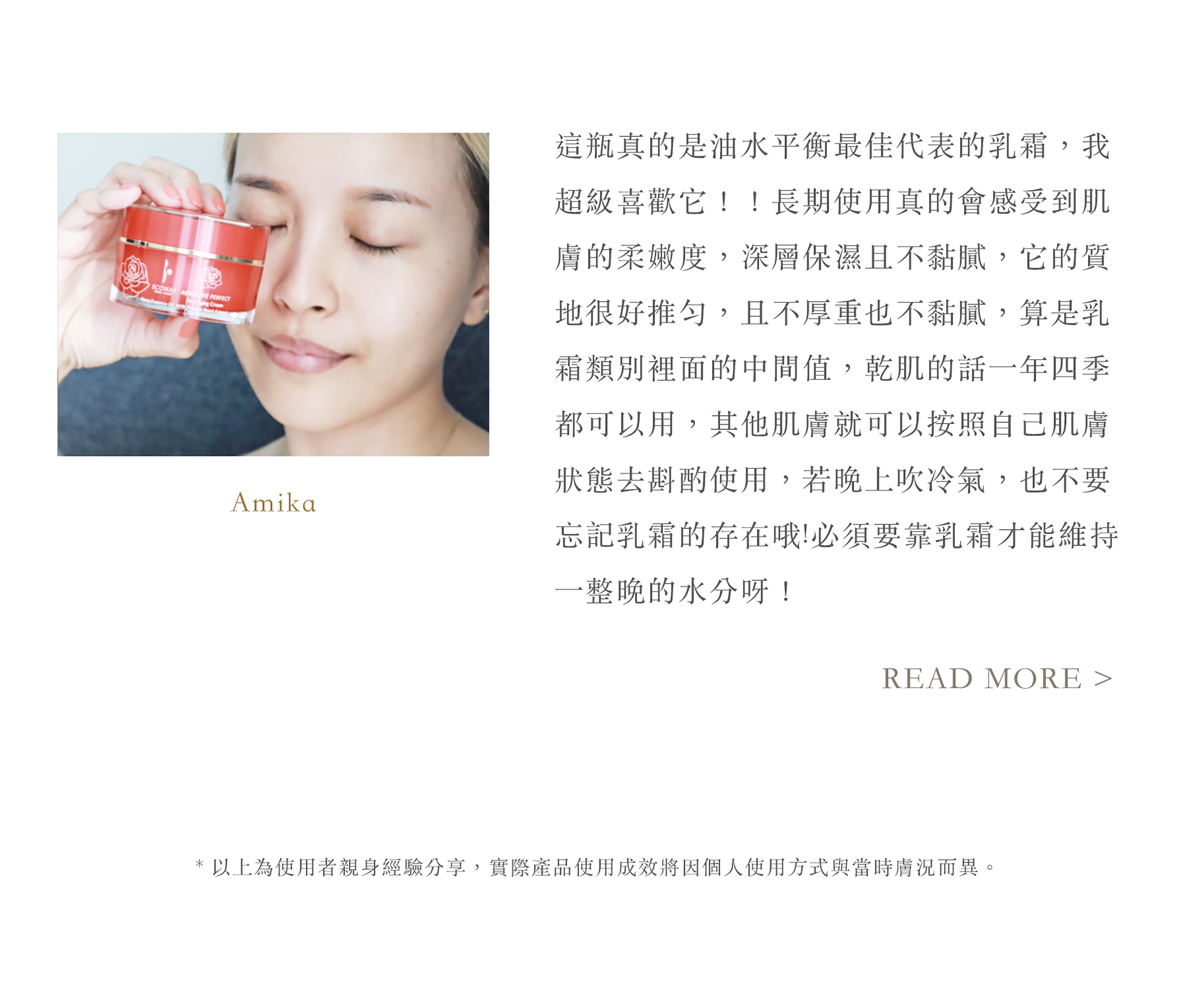| 使用方式 | 早晚皆可使用,取適量(約 5 元硬幣大小)塗抹於全臉 1.基礎保養最後一步:在清潔、化妝水、精華液之後,取適量乳霜點於臉部,以指腹輕柔推開並按摩至吸收,鎖住前序保養成分 2.簡化保養:可單獨使用,快速完成保養步驟 3.依膚質調整: 乾性肌/加強滋潤需求:可將乳霜與精華油(如賦活油)混合後塗抹,提升保濕與修護效果 油性肌/混合肌:建議減量使用,或僅塗抹於臉頰、下巴等乾燥部位,T 字部位可省略,減少肌膚負擔 |