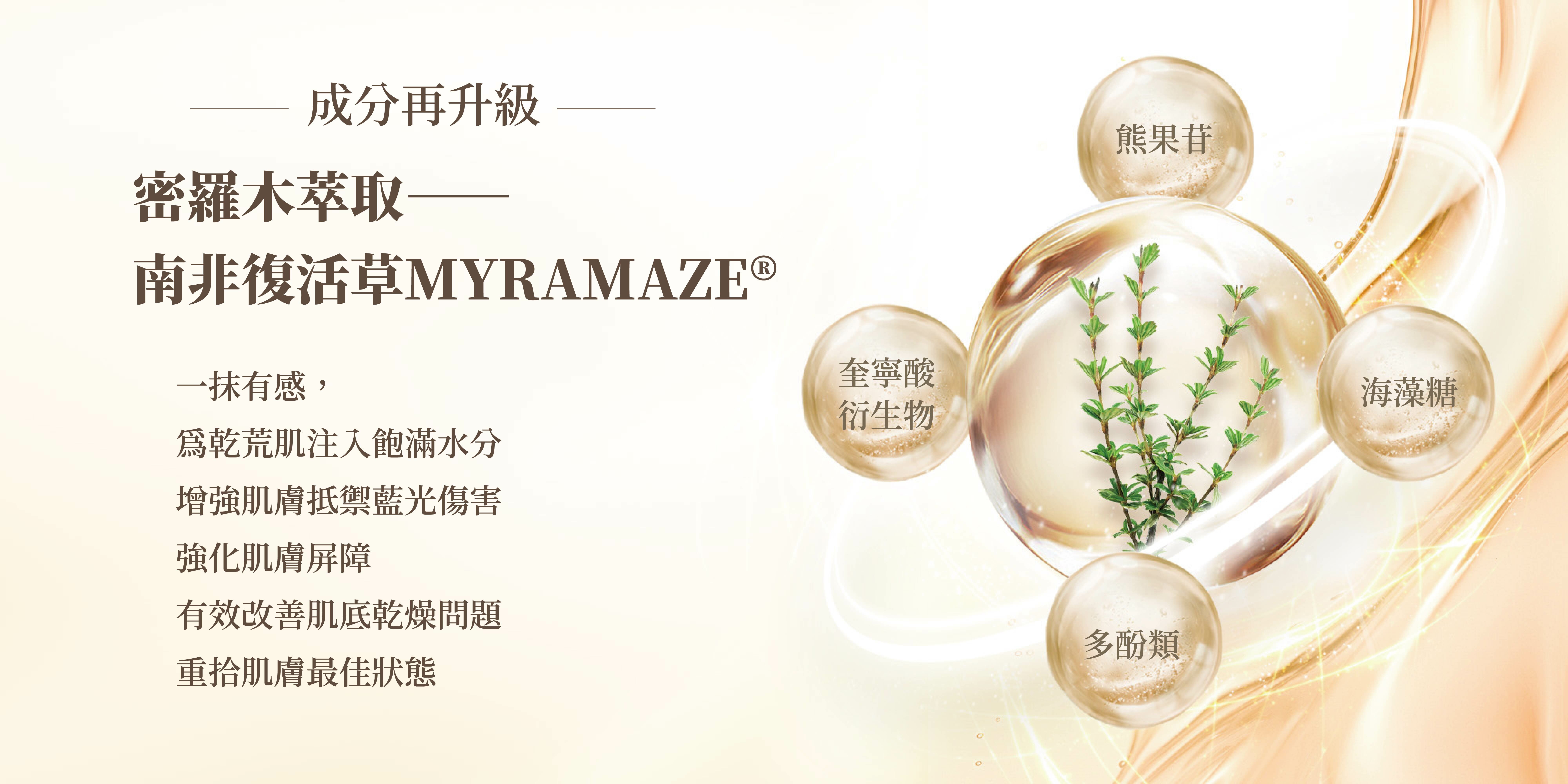✦ 南非復活草萃取提供絕佳活性,可降低藍光迫害、減少光老化,長效保濕,強化肌膚屏障並改善肌底乾燥