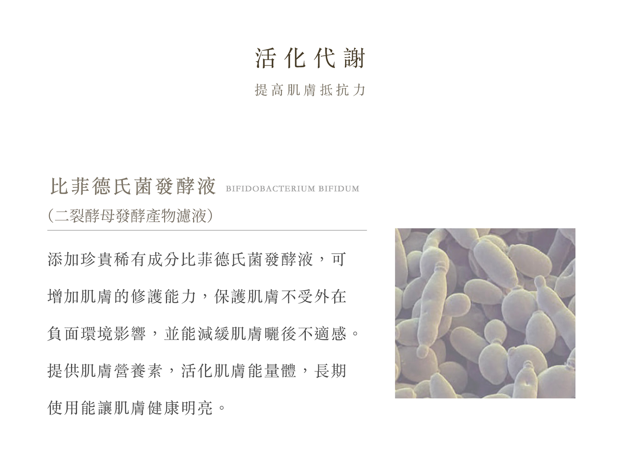 ✦ 高濃度二裂酵母與比菲德氏菌發酵液,活化代謝,強化肌膚屏障