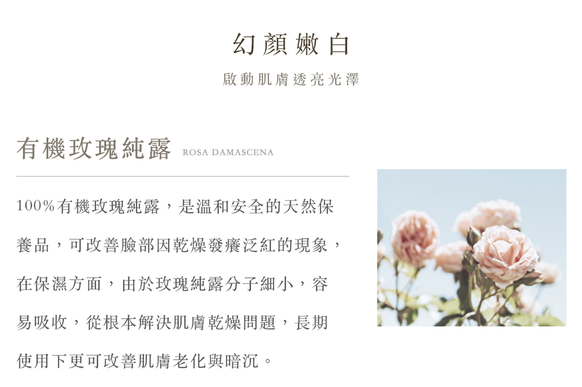 | 主要訴求 | 融合100%有機玫瑰純露與黃金荷荷巴油,深層滋養並修護抗老。高濃度二裂酵母結合南非復活草,能強化肌膚屏障、抵禦藍光,從肌底改善乾燥,重現飽滿緊緻光澤 |
