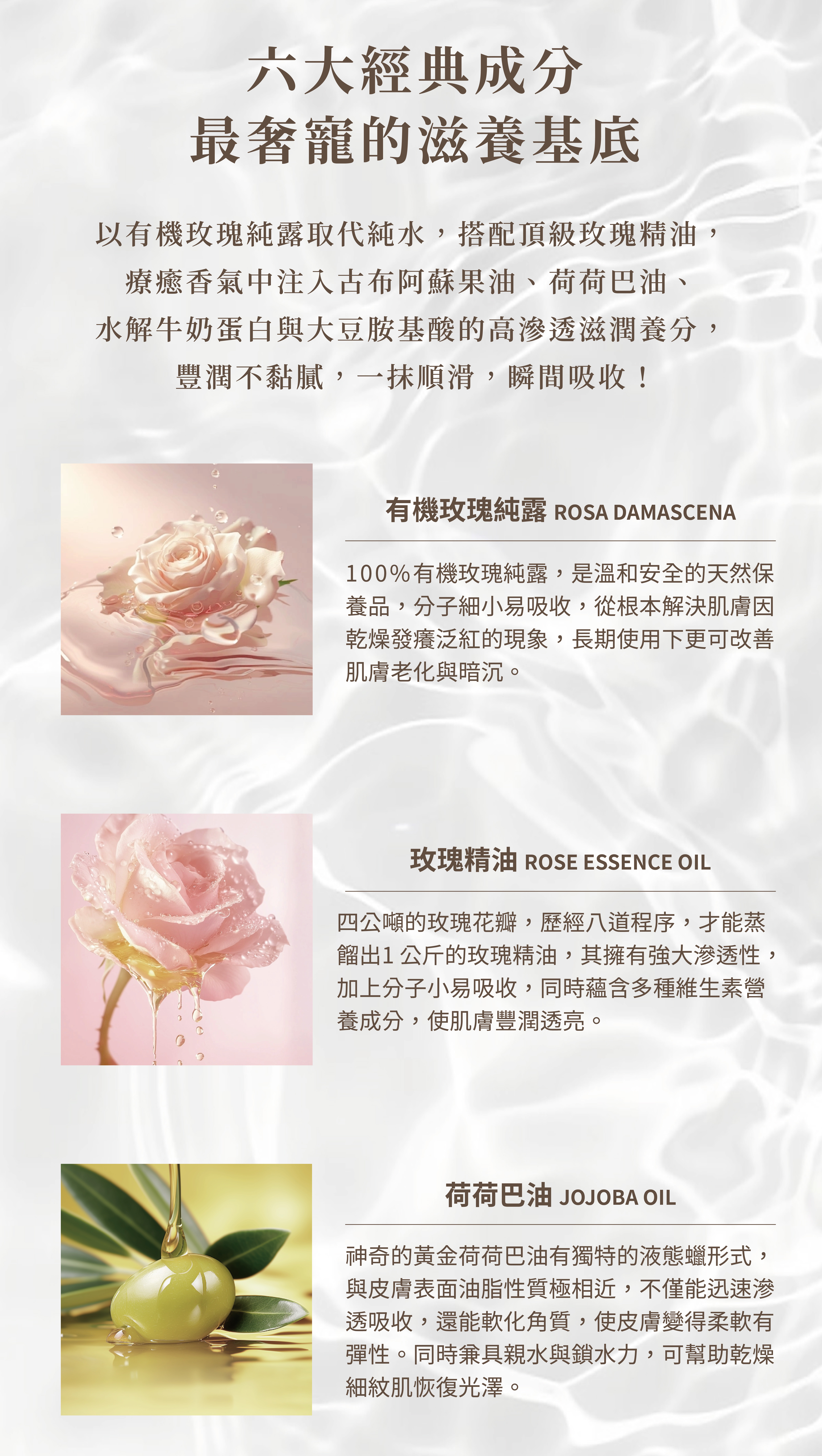 ✦ 添加100%有機玫瑰純露、黃金荷荷巴油、谷布阿蘇樹果,深層滋潤,修護抗老