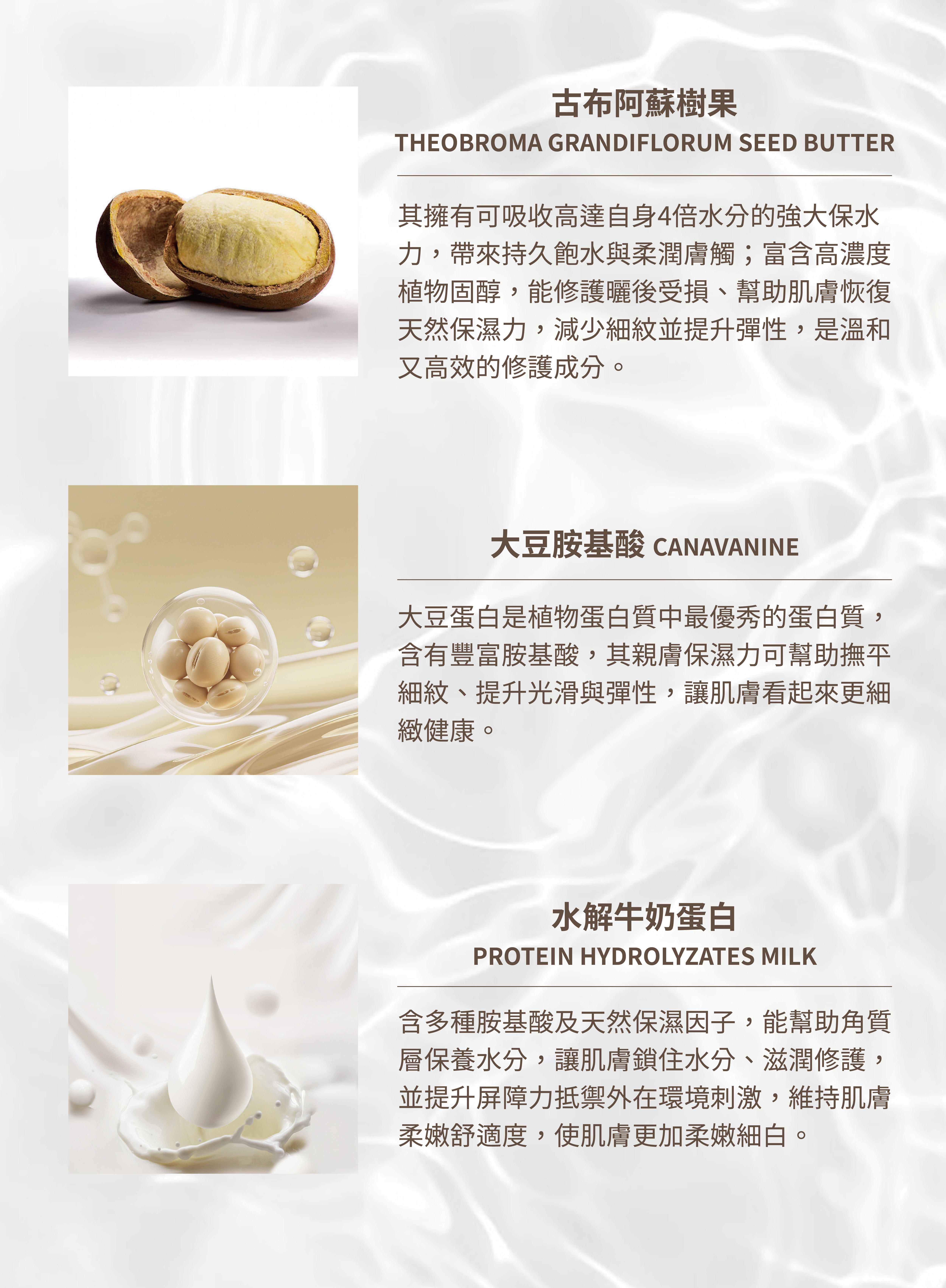 | 使用方式 | 早晚皆可使用,取適量(約 5 元硬幣大小)塗抹於全臉 1.基礎保養最後一步:在清潔、化妝水、精華液之後,取適量乳霜點於臉部,以指腹輕柔推開並按摩至吸收,鎖住前序保養成分 2.簡化保養:可單獨使用,快速完成保養步驟 3.依膚質調整: 乾性肌/加強滋潤需求:可將乳霜與精華油(如賦活油)混合後塗抹,提升保濕與修護效果 油性肌/混合肌:建議減量使用,或僅塗抹於臉頰、下巴等乾燥部位,T 字部位可省略,減少肌膚負擔 |