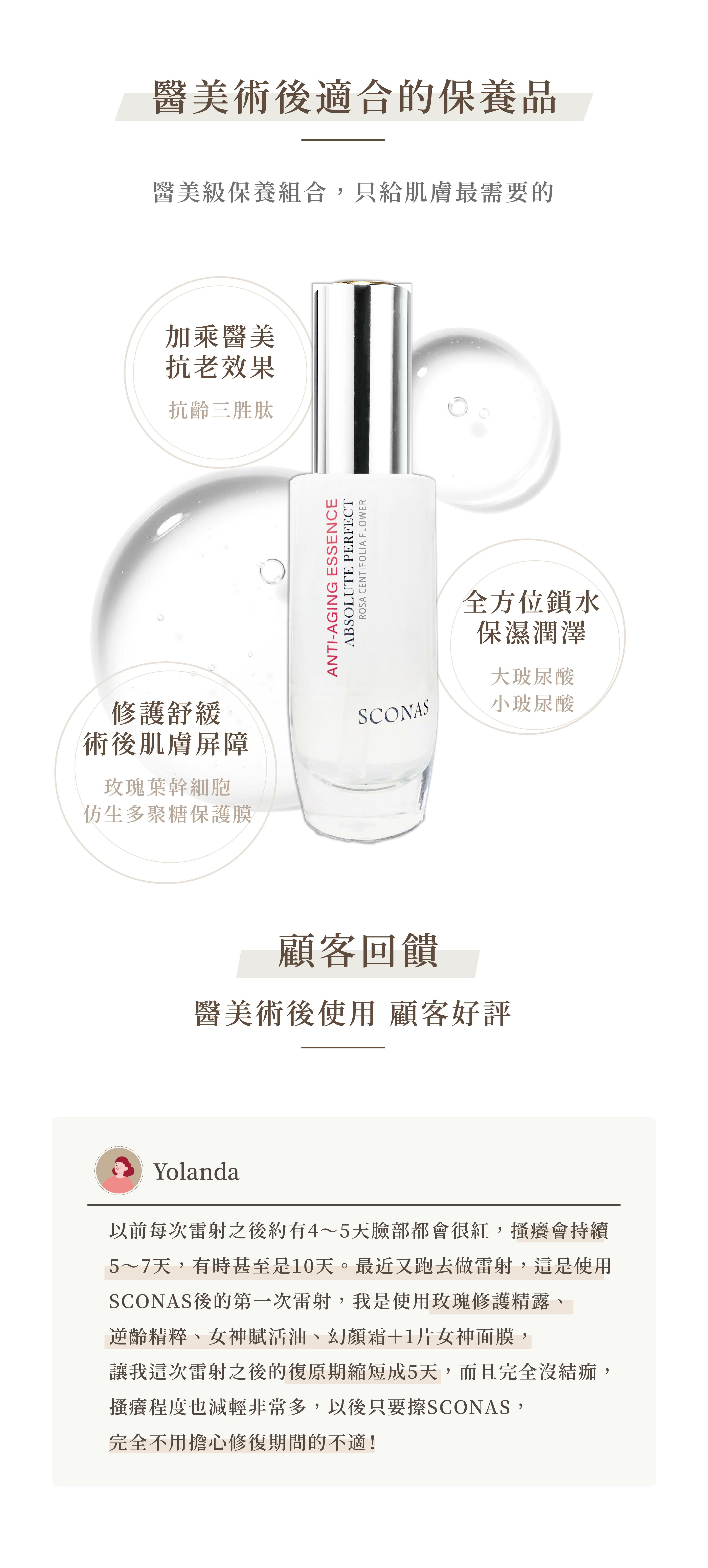 | 溫馨提醒 | ※ 沒有任何一樣保養品適合所有人,使用後若出現不適,請立即停止使用並觀察肌膚後續狀況,聯繫 Sconas 客服,若有需要,視情況尋求皮膚科醫師協助 |