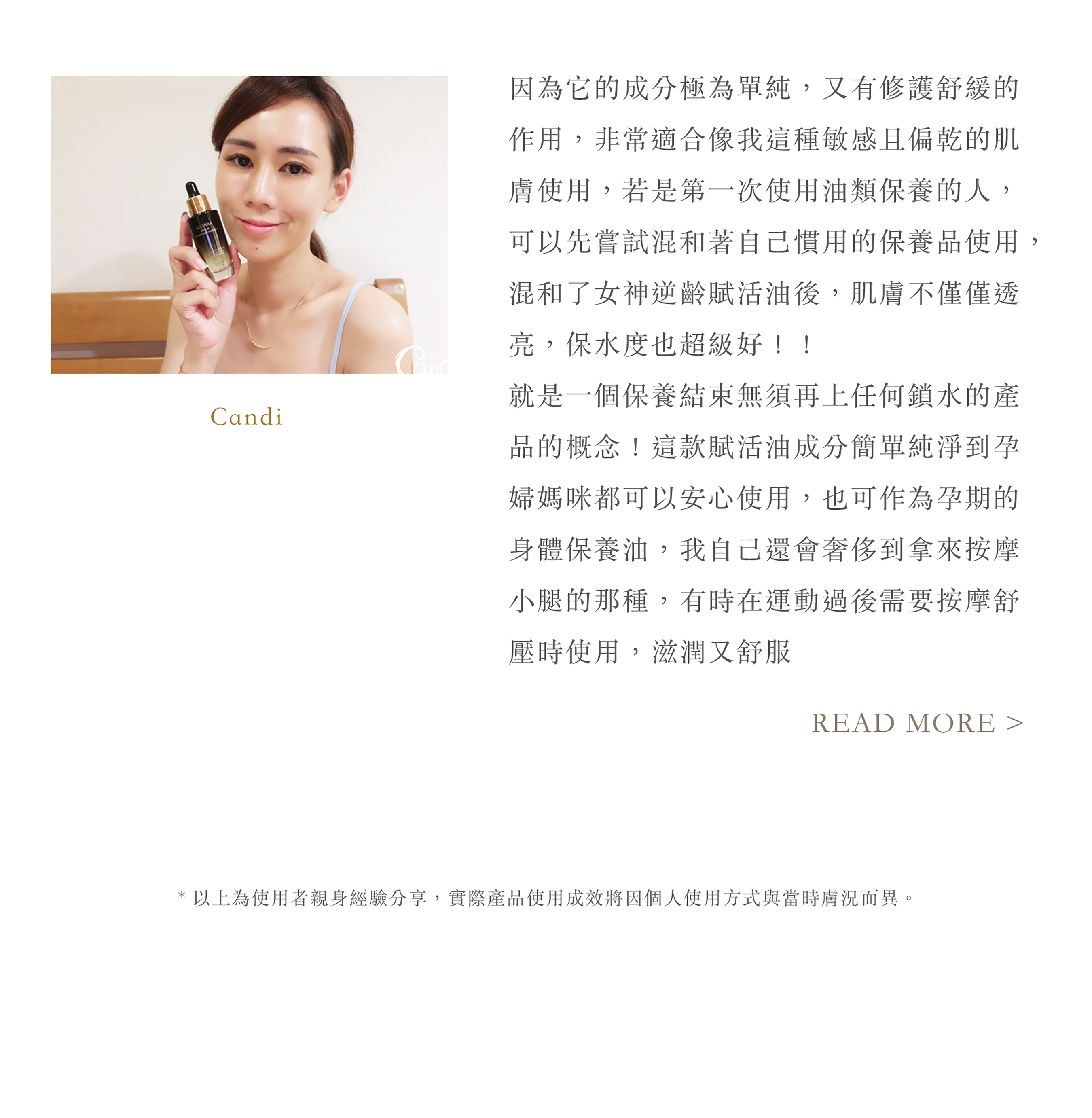 • 質地細緻,輕盈如水,讓你對「 油 」保養,從此改觀。