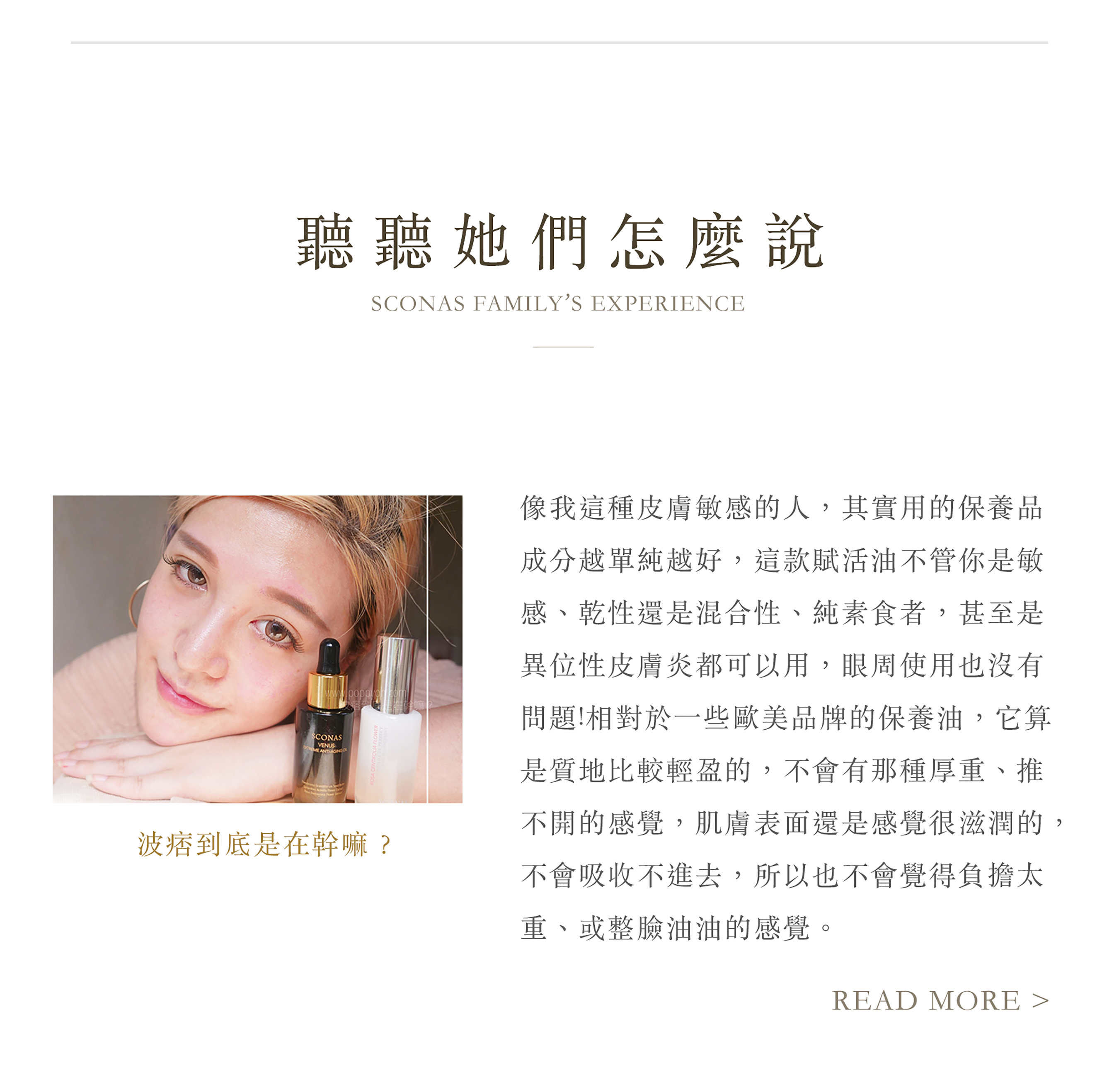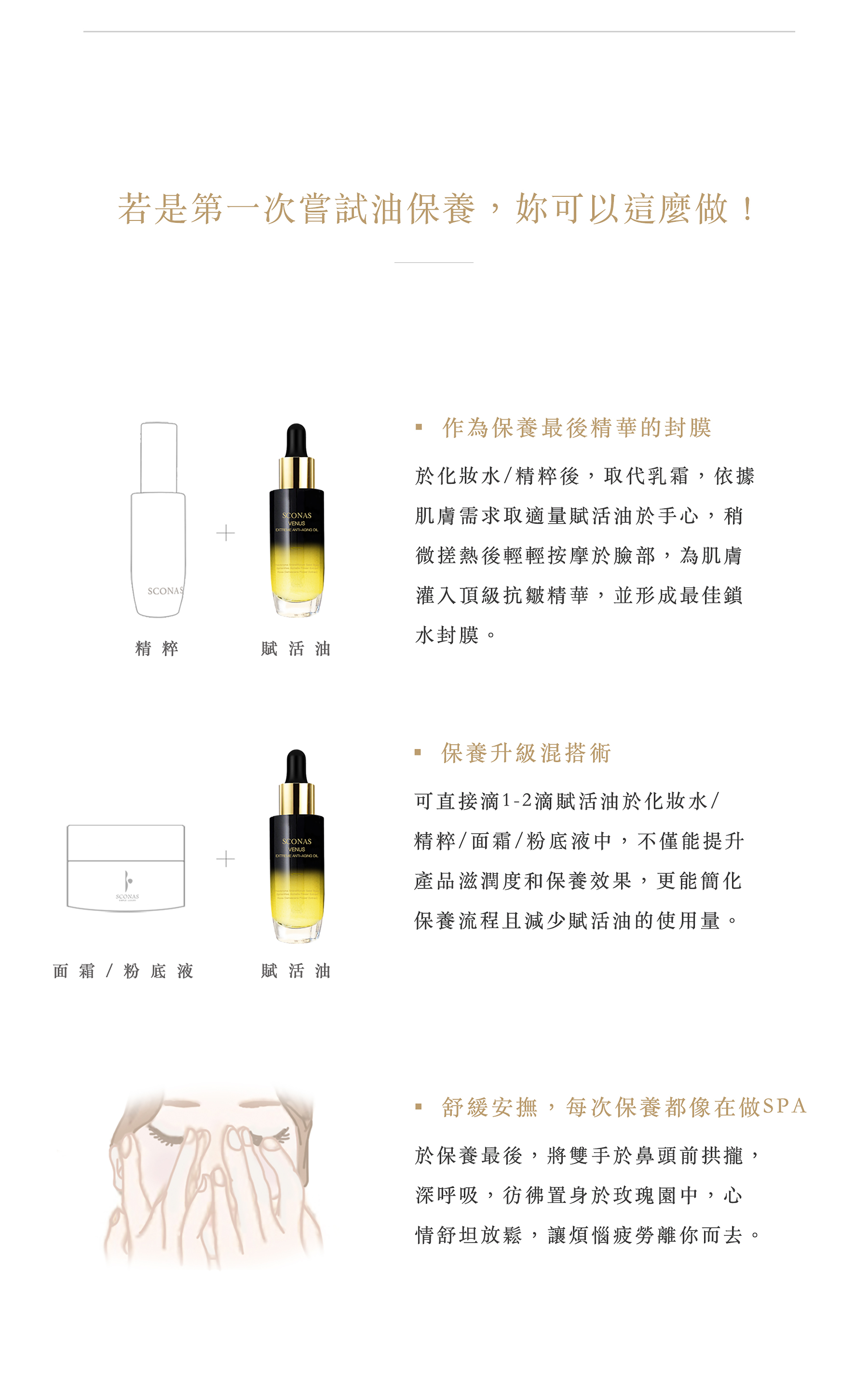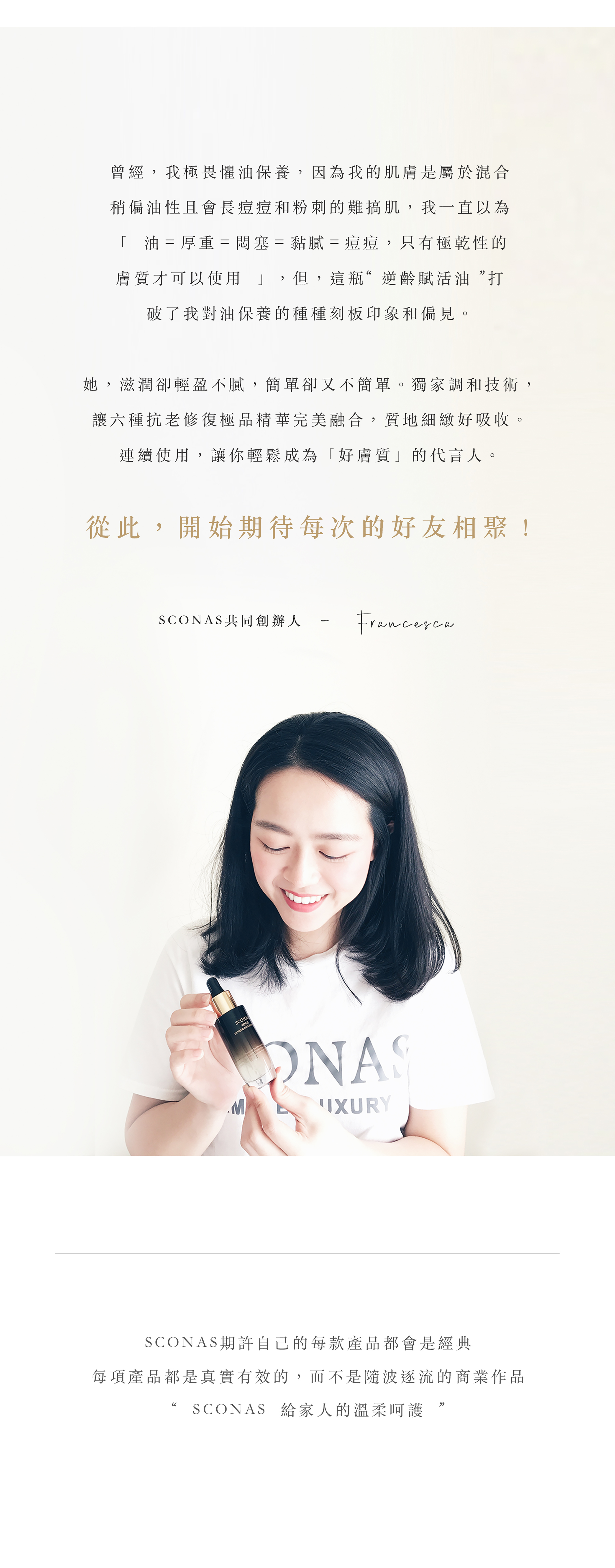提醒您:沒有任何一樣保養品適合所有人,使用後若有不適,請立即停止使用並觀察肌膚後續狀況,聯繫SCONAS客服,若有需要,視情況尋求皮膚科醫師協助。
