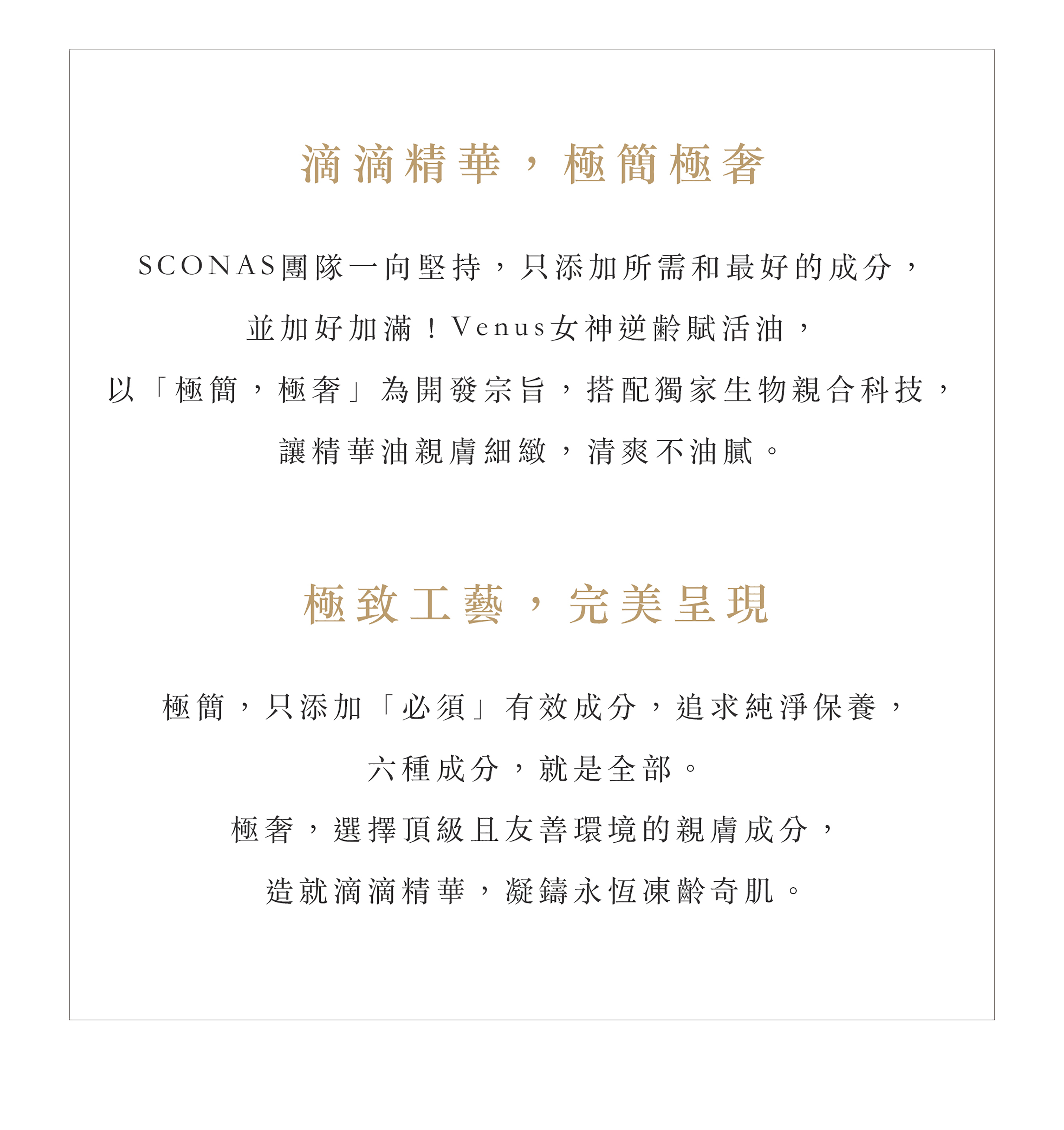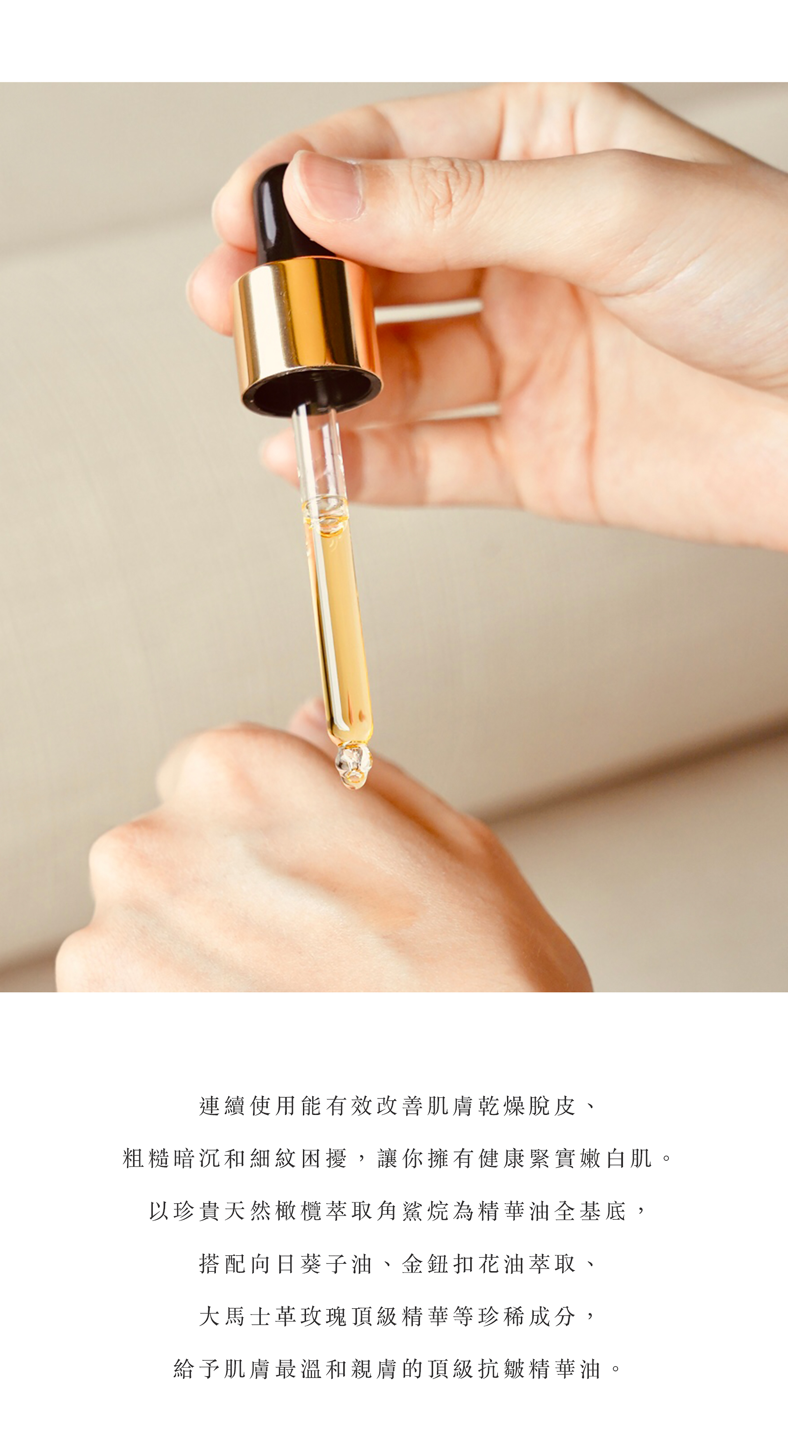 • 針對敏弱、乾燥紅癢、粗糙、暗沉泛黃和有細紋困擾者設計的極致抗皺緊緻精華油。