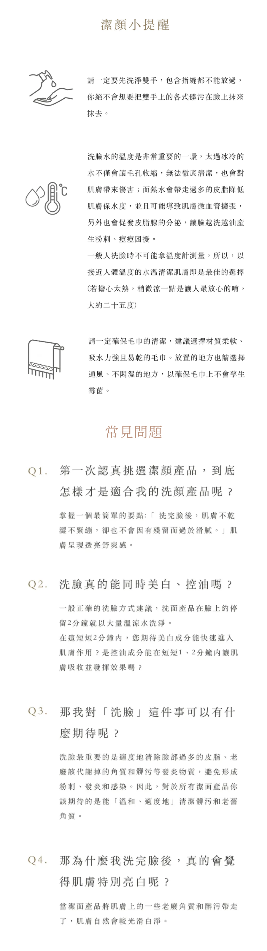 獨家泡沫科技,綿密Q彈泡泡,深入毛孔,徹底清潔,溫和洗淨髒污,潔淨保水,不乾澀,不緊繃,簡單又純粹的淨、透、亮。