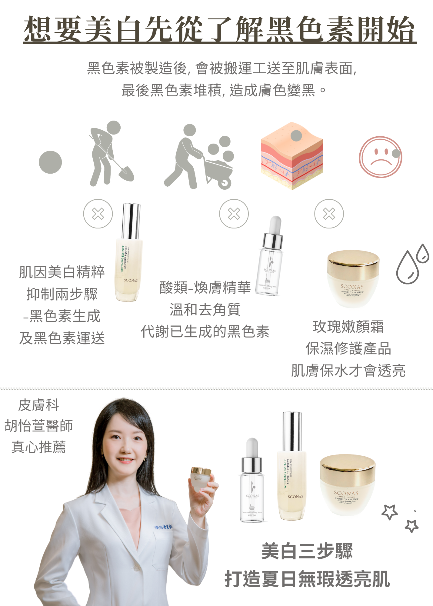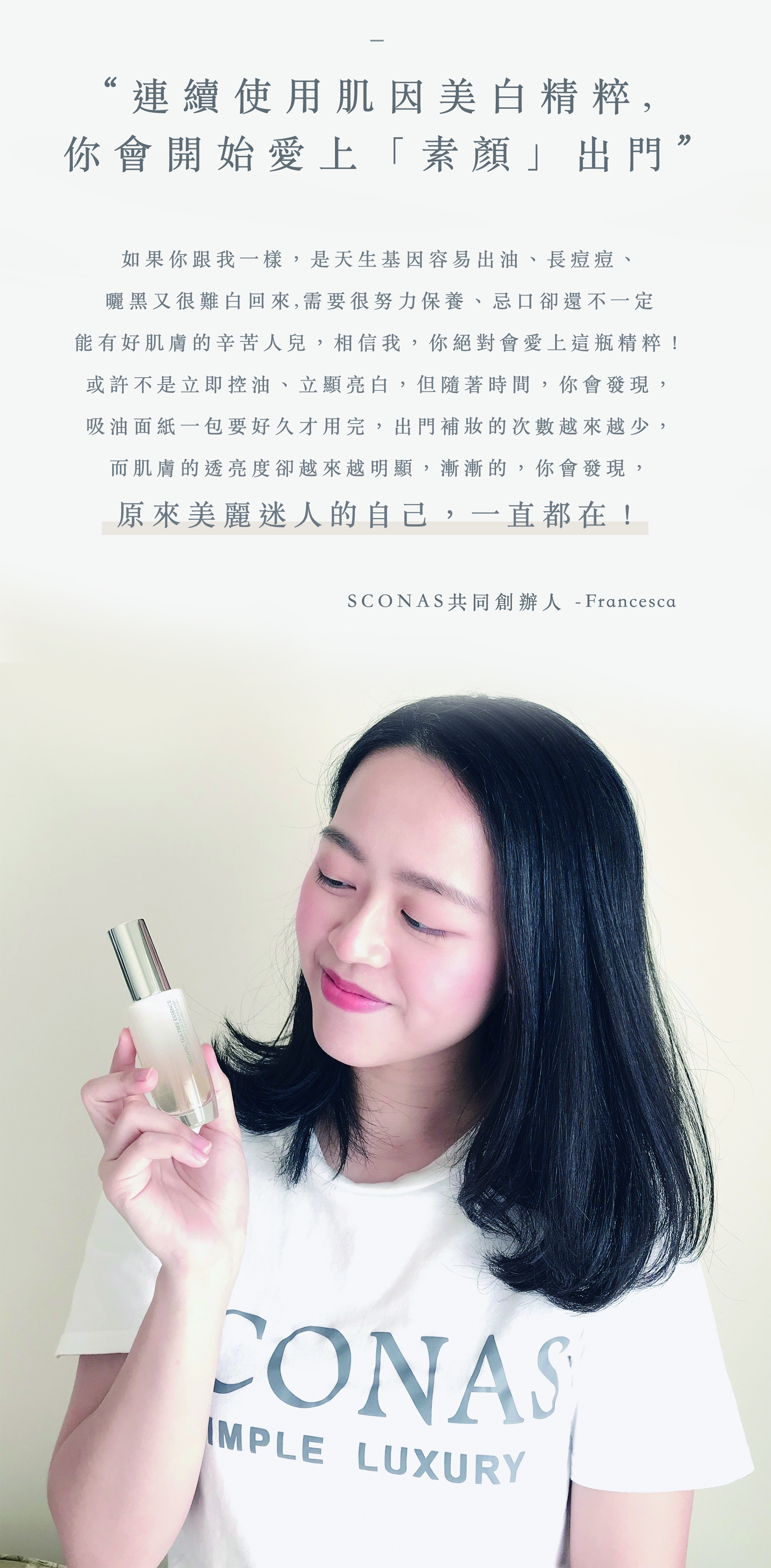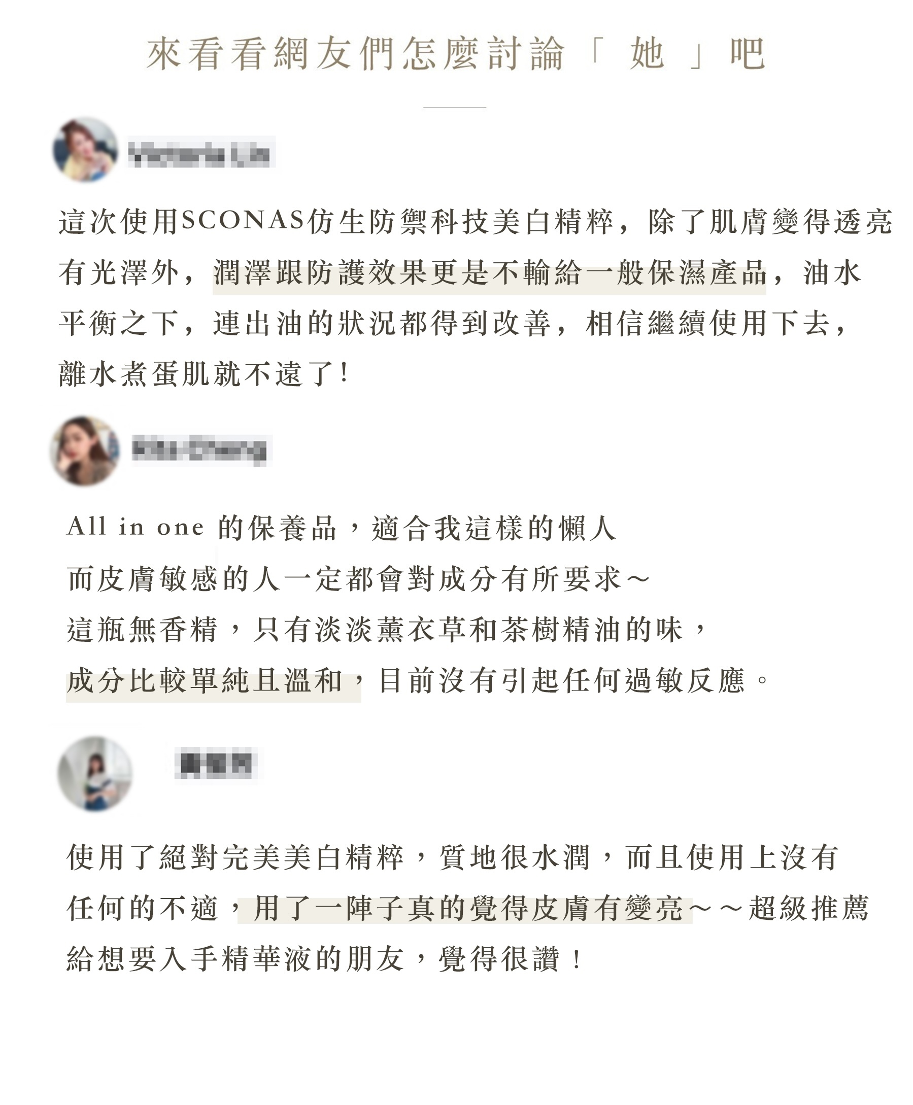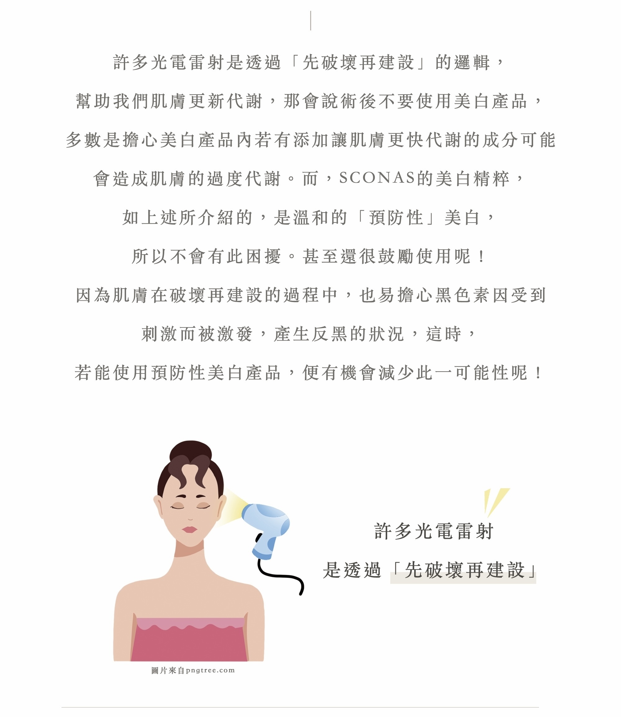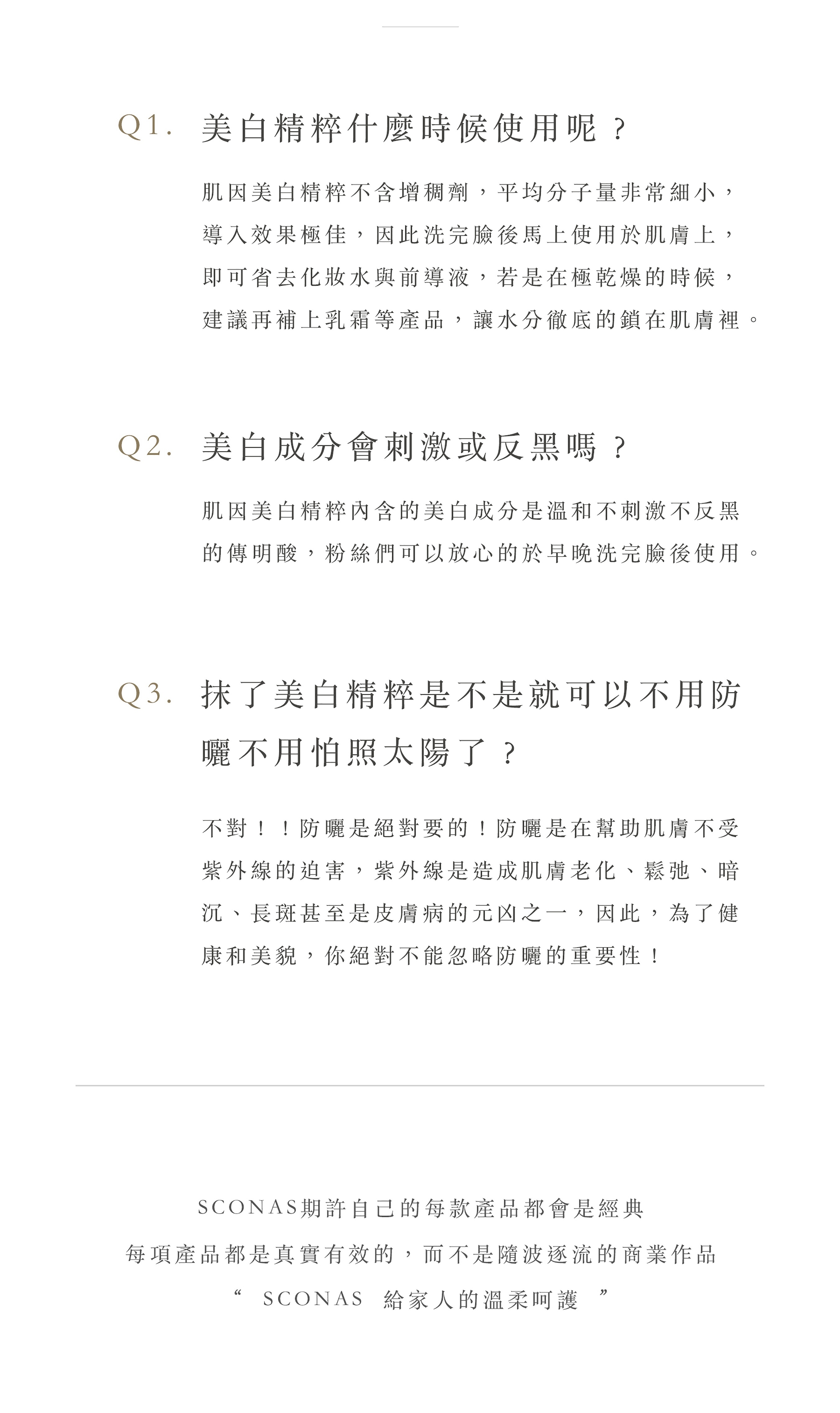 | 溫馨提醒 | ※ 沒有任何一樣保養品適合所有人,使用後若出現不適,請立即停止使用並觀察肌膚後續狀況,聯繫 Sconas 客服,若有需要,視情況尋求皮膚科醫師協助 ※ 黃色沉澱物為三胜肽正常現象,搖晃瓶身即可,請放心使用 |