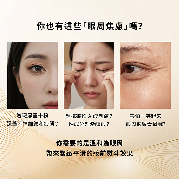 全方位呵護細紋紋路、緊緻彈潤、眼周暗沉與乾燥不適,日夜皆可用、清爽好吸收,適合敏弱肌也想有效保養眼周及改善紋路困擾的你。