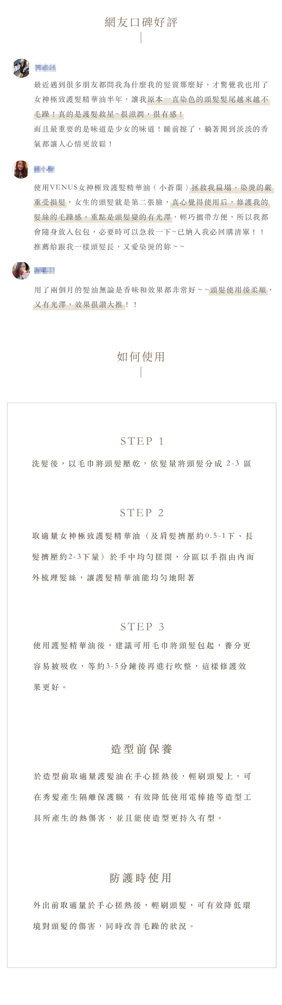 | 使用方式 | 於洗髮後、吹髮前,取 1-2 滴精華油於掌心搓熱,均勻塗抹於髮中至髮尾 濕髮時:按壓3-4下,均勻地塗抹於髮尾,有效滋養髮絲,給予光澤 乾髮時:按壓1-2下,塗抹於髮尾,有效立即撫平毛躁 |