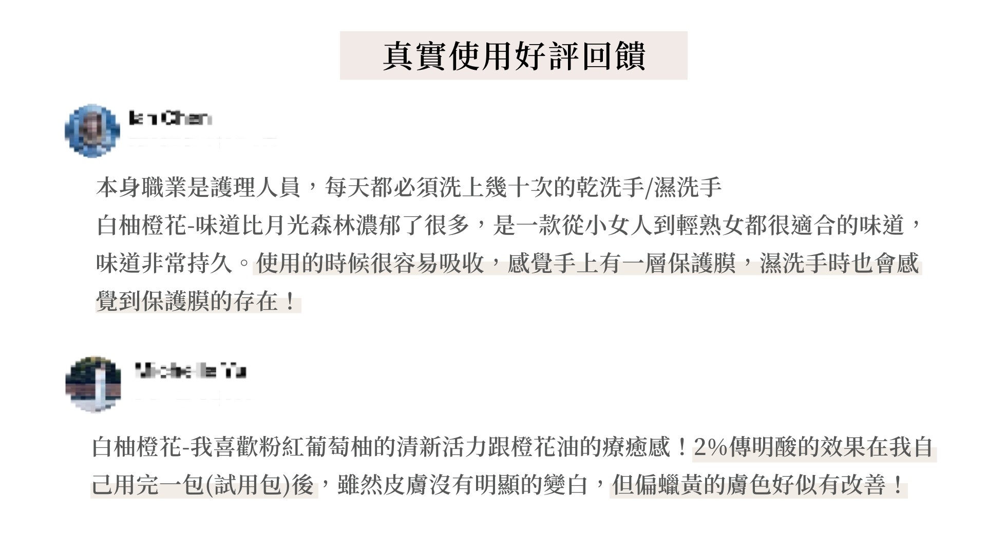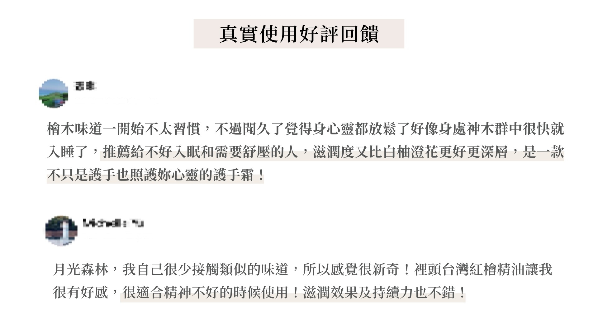 | 成分 | 月光森林護手霜(滋潤保濕修護) Deionized water, Propanediol, Glyceryl Stearate SE, Cetearyl Ethylhexanoate, Propylene Glycol, Butyrospermum Parkii, Diethylhexyl Carbonate, Cetearyl Alcohol, Palmitic Acid, Stearic Acid, Squalane, Dimethicone, Cladosiphon Novae-Caledoniae Extract, Glycerin, Hydrolyzed Caesalpinia Spinosa Gum, Caesalpinia Spinosa Gum, Phenoxyethanol, Potassium Sorbate, Ethylhexylglycerin, Sodium Hydroxide, Carbomer, Pentylene Glycol, Chlorphenesin, Polysorbate 20, Sodium Acrylates Copolymer, Lecithin, Lemon Oil, Peppermint Oil, Citrus Aurantium Dulcis Oil, Octahydro-5-methoxy-4,7-methano-1H-indene-2-carboxaldehyde, Pelargonium Graveolens Oil, β-Elemene, β-Cadinene, Methyl Linalool, Lavandin Grosso Oil, 1-(1,2,3,4,5,6,7,8-Octahydro-2,3,8,8-tetramethyl-2-naphthalenyl)-ethan-1-one (and isomers), Chamaecyparis Formosensis Oil, Myroxylon Balsamum Resin Oil 繚繞玫瑰護手霜(滋潤修護抗皺) Deionized water, Propanediol, Glyceryl Stearate SE, Cetearyl Ethylhexanoate, Propylene Glycol, Butyrospermum Parkii, Diethylhexyl Carbonate, Cetearyl Alcohol, Palmitic Acid, Stearic Acid, Squalane, Dimethicone, Hydrolyzed Ceratonia Siliqua Seed Extract, Glycerin, Hydrolyzed Caesalpinia Spinosa Gum, Caesalpinia Spinosa Gum, Phenoxyethanol, Potassium Sorbate, Ethylhexylglycerin, Sodium Hydroxide, Carbomer, Sodium Benzoate, Chlorphenesin, Polysorbate 20, Sodium Acrylates Copolymer, Lecithin, Ethyl Acetoacetate Ethyleneglycol Ketal, Geraniol, Citronellol, Phenyl Ethyl Alcohol, Methyl Dihydrojasmonate, Acetic Acid (1-oxopropoxy)-, 1-(3,3-dimethylcyclohexyl) Ethyl Ester (9CI), Pelargonium Graveolens Oil, Myroxylon Balsamum Resin Oil, Damask Rose Absolute (Damask Rose Oil), Luanta Fir Oil 西柚橙花護手霜(清爽美白) Deionized water, Propanediol, Cyclopentasiloxane, Dimethicone, Isohexadecane, Tranexamic Acid, Sodium Acrylates Copolymer, Squalane, Diphenylsiloxy Phenyl Trimethicone, Lecithin, Sodium Stearoyl Glutamate, Sodium Acrylate/Sodium Acryloyldimethyl Taurate Copolymer, Polysorbate 80, Sorbitan Octadecanoate, Dimethiconol, Glycerin, Hydrolyzed Caesalpinia Spinosa Gum, Caesalpinia Spinosa Gum, Phenoxyethanol, Potassium Sorbate, 1,2-Hexanediol, Chlorphenesin, O-cymen-5-ol, Polyglyceryl-2 Laurate, Polyglyceryl-10 Laurate, Pink Grapefruit Oil, Tetrahydro-4-methyl-2-(2-methylpropyl)-2H-pyran-4-ol, Ethyl Acetoacetate Ethyleneglycol Ketal, Citronellol, Linalyl Acetate, Phenyl Ethyl Alcohol, Methyl Dihydrojasmonate, Benzoic Acid, 2-{(7-hydroxy-3,7-dimethyloctylidene}amino)methyl ester, Neroli Organic Oil, Pelargonium Graveolens Oil, Acetic Acid (1-oxopropoxy)-, 1-(3,3-dimethylcyclohexyl) Ethyl Ester (9CI), Oxacyclohexadec-12-en-2-one, (12E)- |