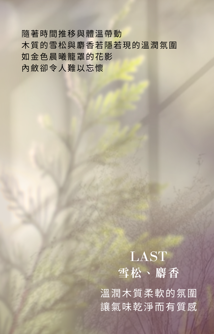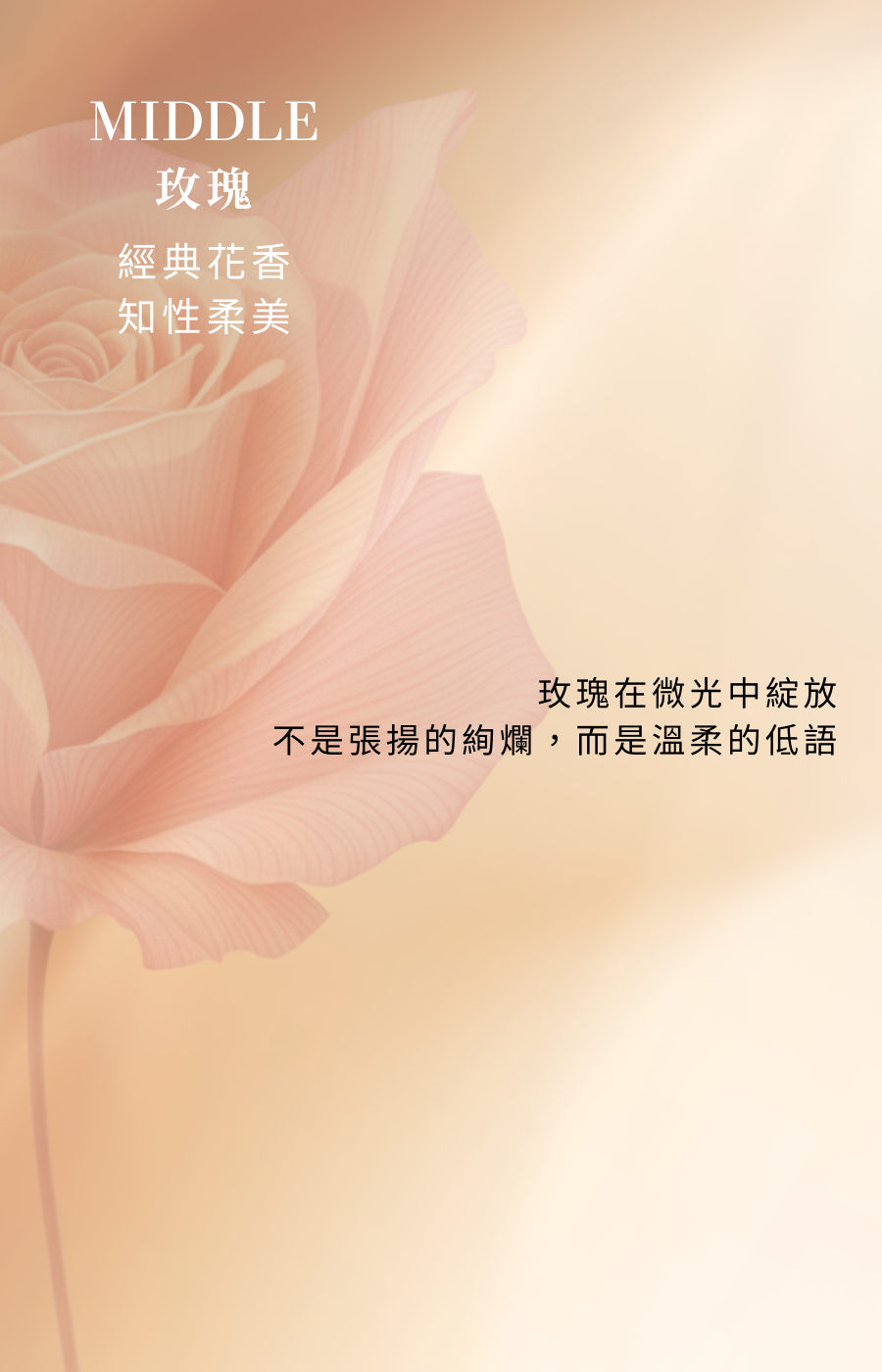 以清新柑橘與風信子開場,轉入玫瑰的優雅甜美,最後沉澱為麝香與琥珀的溫柔木質 —