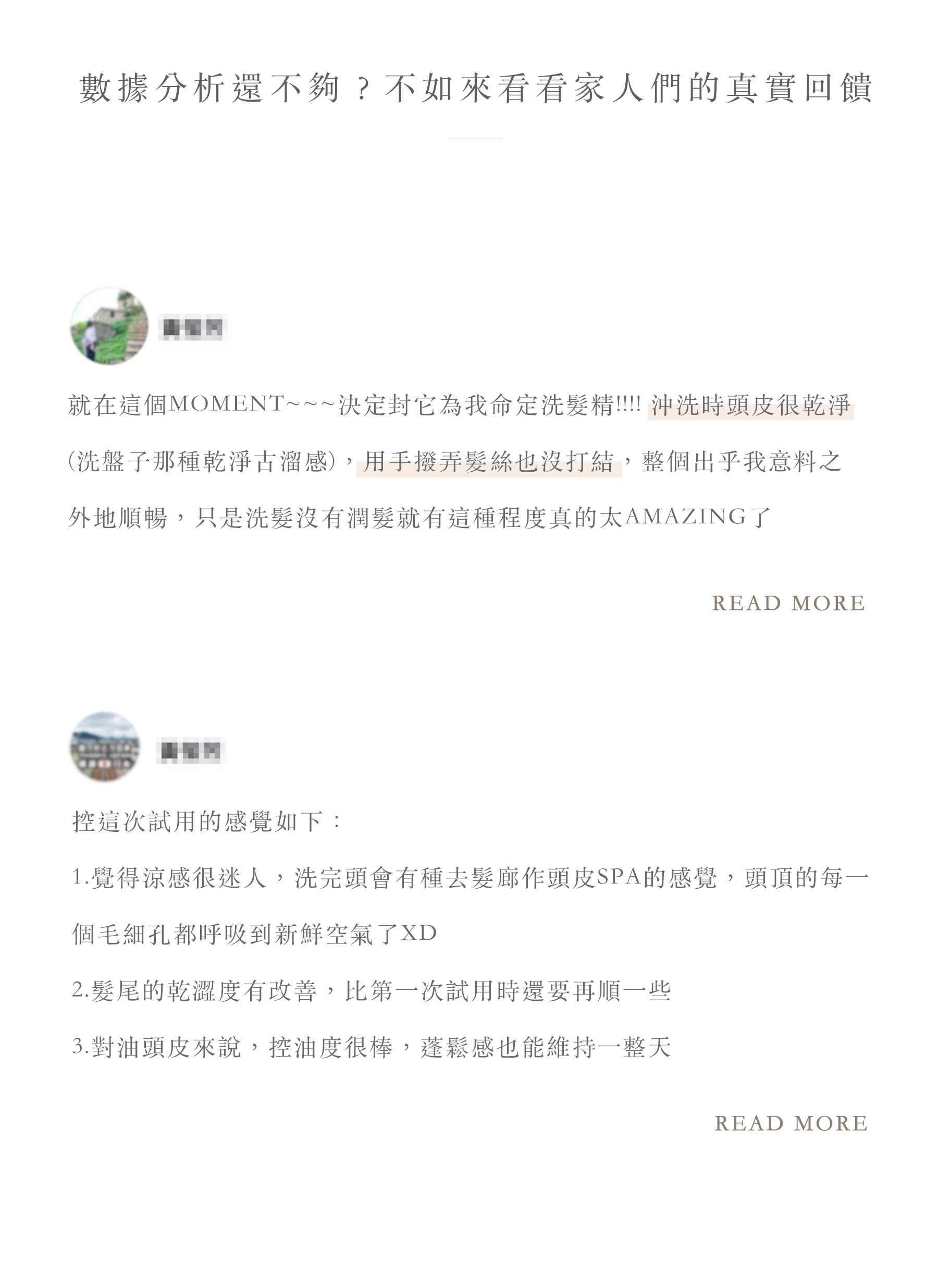| 主要訴求 | 無矽靈胺基酸配方,溫和潔淨同時平衡頭皮生態。多種植萃能有效改善頭皮氣味與出油問題,搭配清涼薄荷精油,為您帶來舒爽輕盈的洗後感受。強健髮根、增加髮絲蓬鬆度,讓您告別油膩,享受清爽又健康的迷人秀髮 |