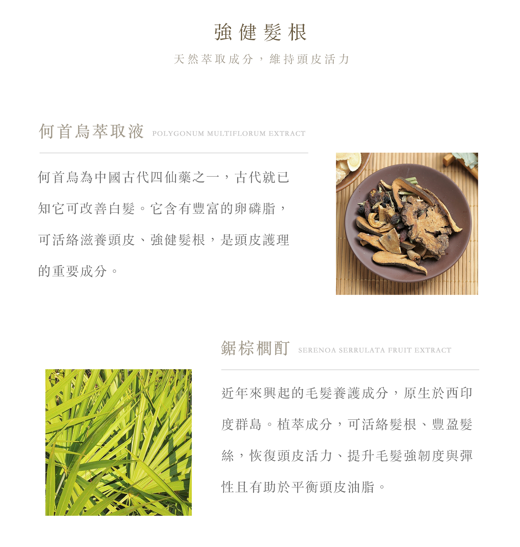 ✦ 添加何首烏萃取、鋸棕櫚酊,有效強健髮根