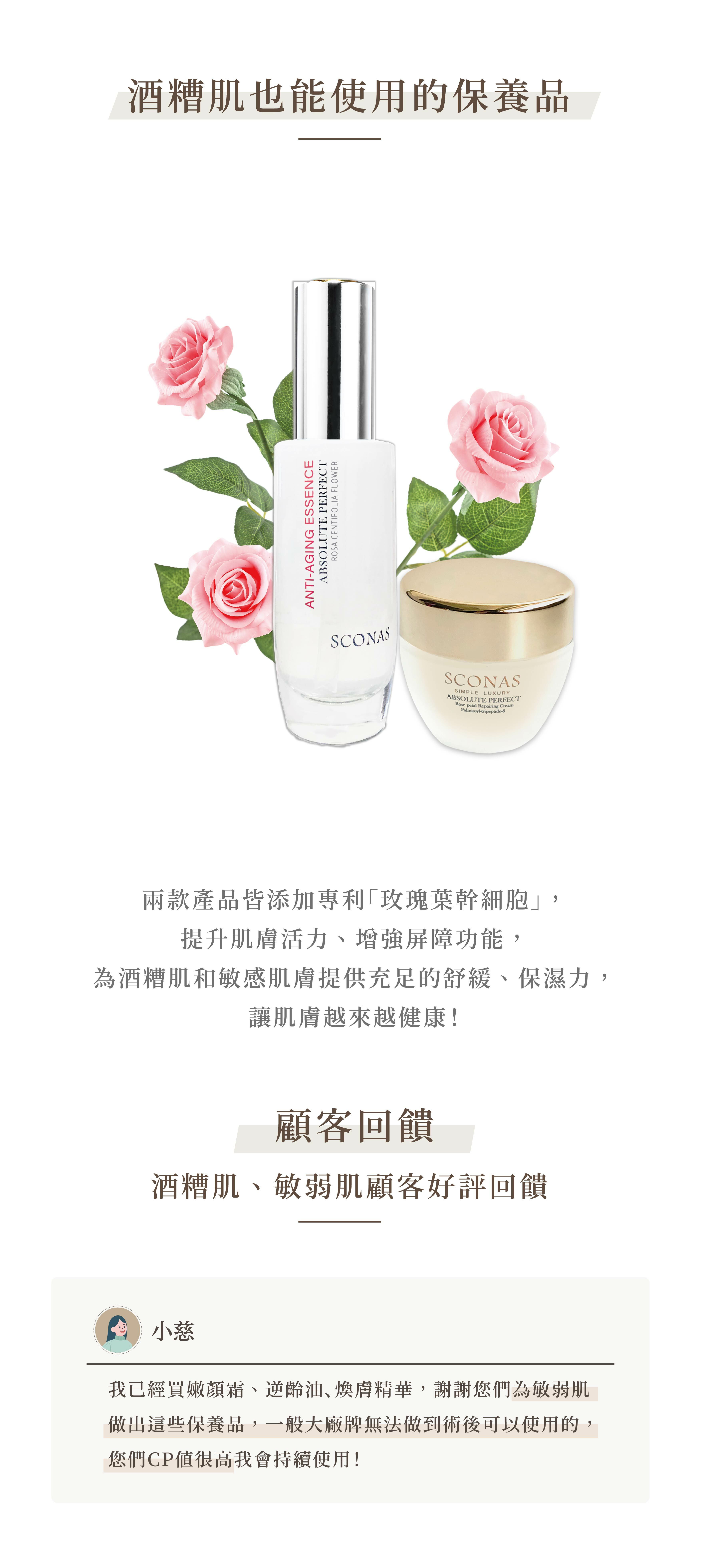 * 提醒您:沒有任何一樣保養品適合所有人,使用後若有不適,請立即停止使用並觀察肌膚後續狀況,聯繫SCONAS客服,若有需要,視情況尋求皮膚科醫師協助。