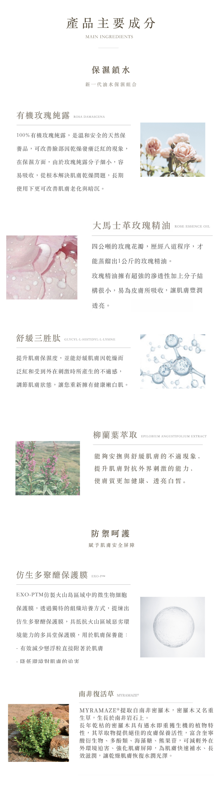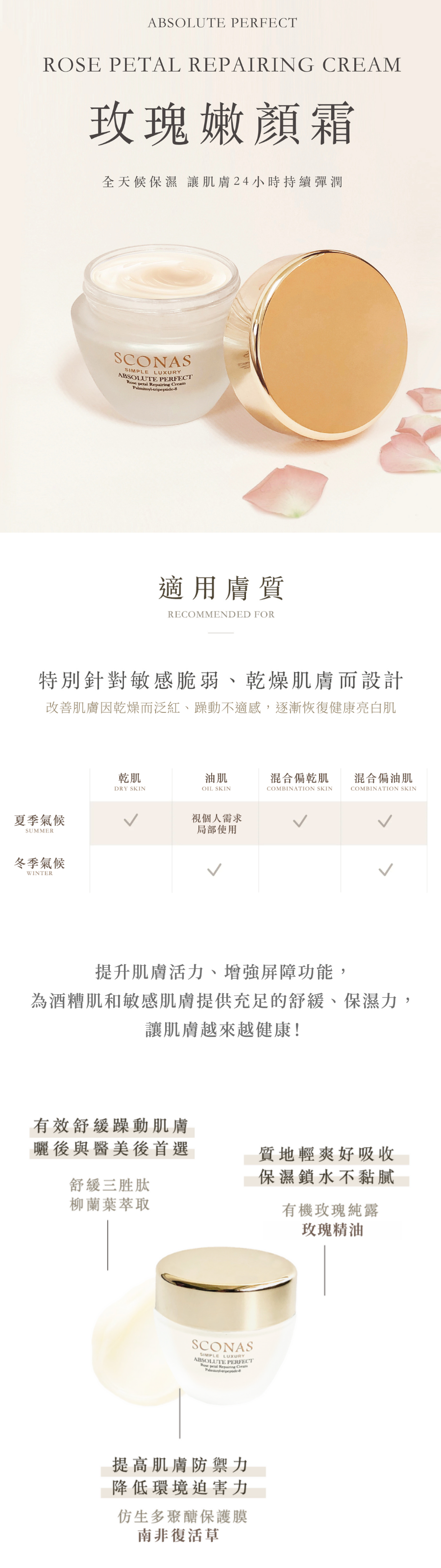 | 主要訴求 | 融合珍貴玫瑰精萃與先進水凝科技,深層補水保濕,溫和舒緩敏弱肌膚,有效抗老修護,重建肌膚屏障,醫美術後專用配方,讓肌膚重現水潤透亮 |