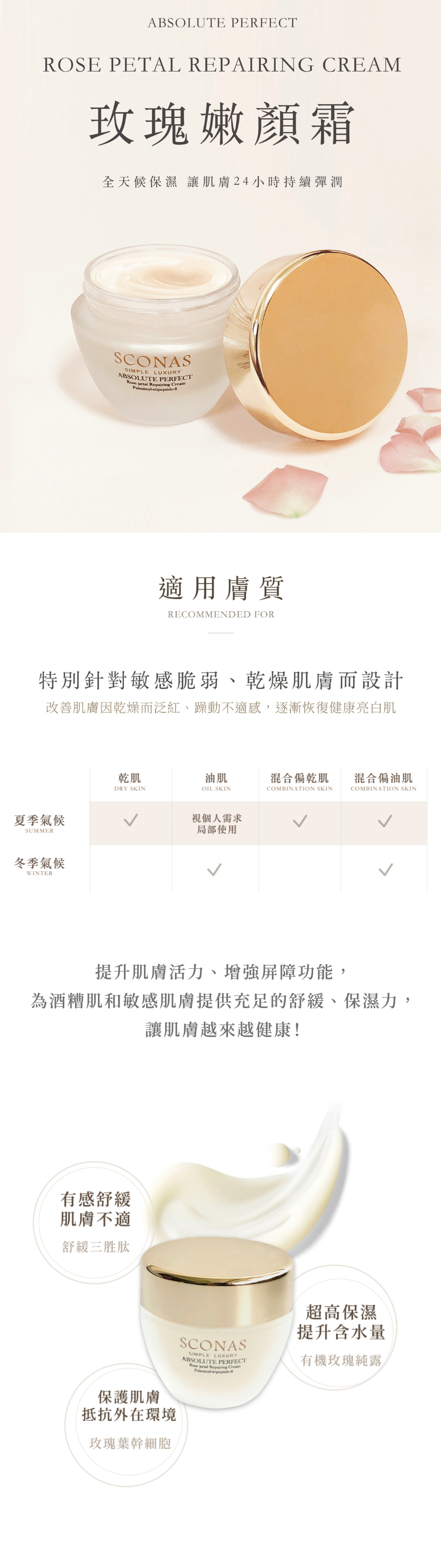 以抗齡三胜肽與玫瑰葉幹細胞萃取活性成分,有效活化肌膚、淡化細紋,搭配諾貝爾級抗老成分-富勒烯,淡紋、細緻、修護、亮白一次精準改善肌膚老化問題,使肌膚維持健康年輕狀態。清爽水潤的嫩顏霜,蘊含玫瑰葉幹細胞及舒緩三胜肽等絕佳保濕修護成分,有效修護肌膚屏障、長效保濕,全天候滋潤鎖水穩定膚況!