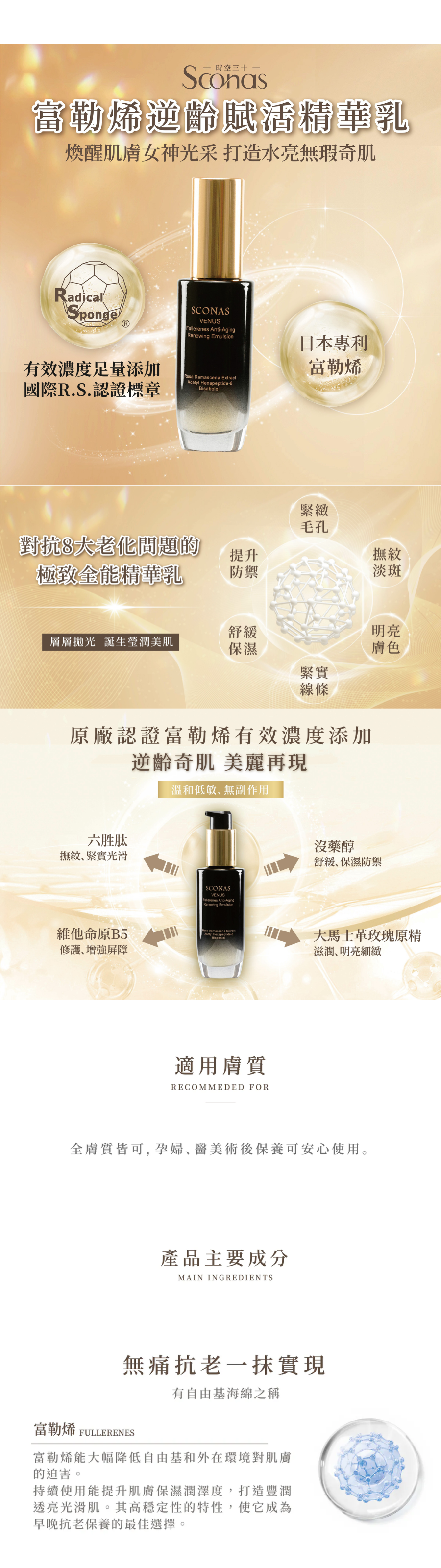 ✦ 日本原廠R.S.專利抗老成分 — 富勒烯,有效濃度添加獲認證標章